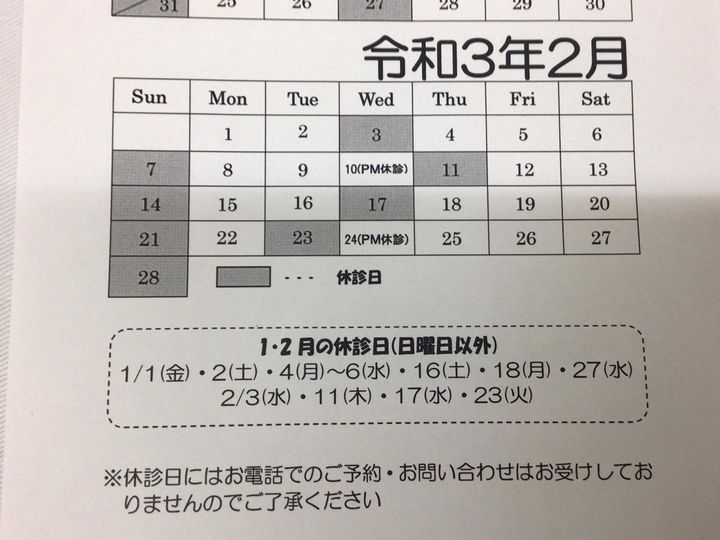 緊急事態宣言が再び出されていますが、コロナの感染拡大が収束するのはいつになるのでしょうか。クリニックでは密にならないように予約をお取りしていますが、緊急の場合や手術など時間通りには行かない要素も多く計画通りにはゆきません。皆様のご協力をお願いします。2月10日、24日は看護学校の授業のため午後は休診です。2月3日と17日はメンテナンスのため1日休診となります。